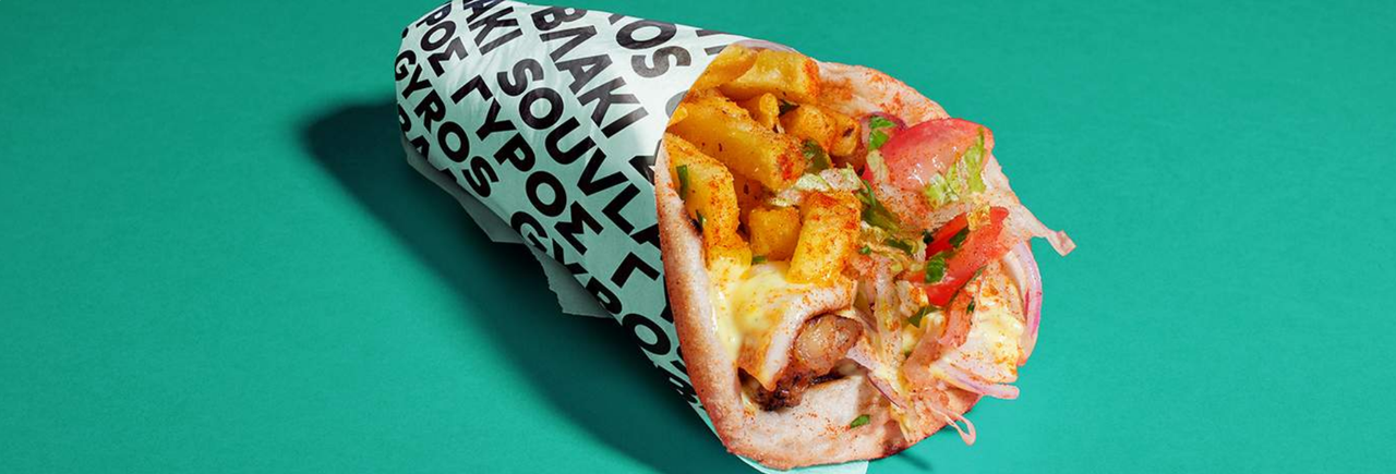 ¡Elige tu gyros wrap favorito y disfrútalo con un entrante gratis! Envuelto en nuestro delicioso pan pita griego artesanal, con lechuga, tomate, cebolla, perejil y la salsa que prefieras. Con Patatas y bebida