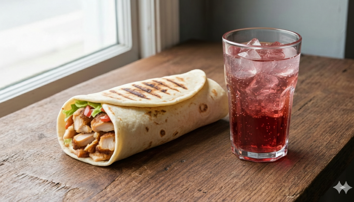 ბებოს ლავაში, სარდელი, სალათის ფურცელი, წიწაკის მწნილი,პომიდორი, ხახვი, მაიონეზი, ყველის სოუსი, კეტჩუპი