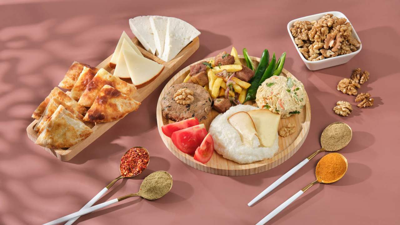 კიტრი პომიდვრის სალათი, ღომი ყველი-მიქსი, ბადრიჯნის ფხალი, გებჟალია.
