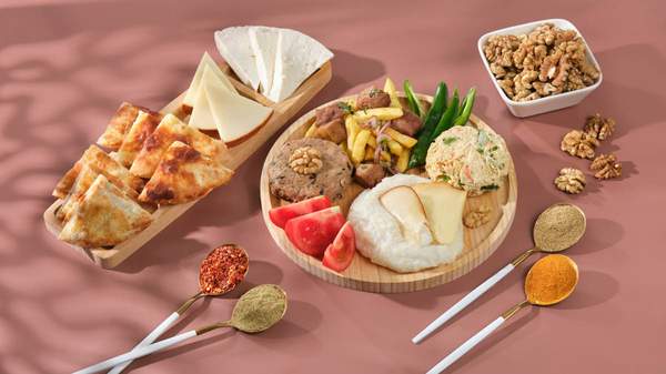 ქათმის სალატი, ლობიოს ფხალი, ღომი და ყველი-მიქსი, ხარჩო საქონლის ხორცით