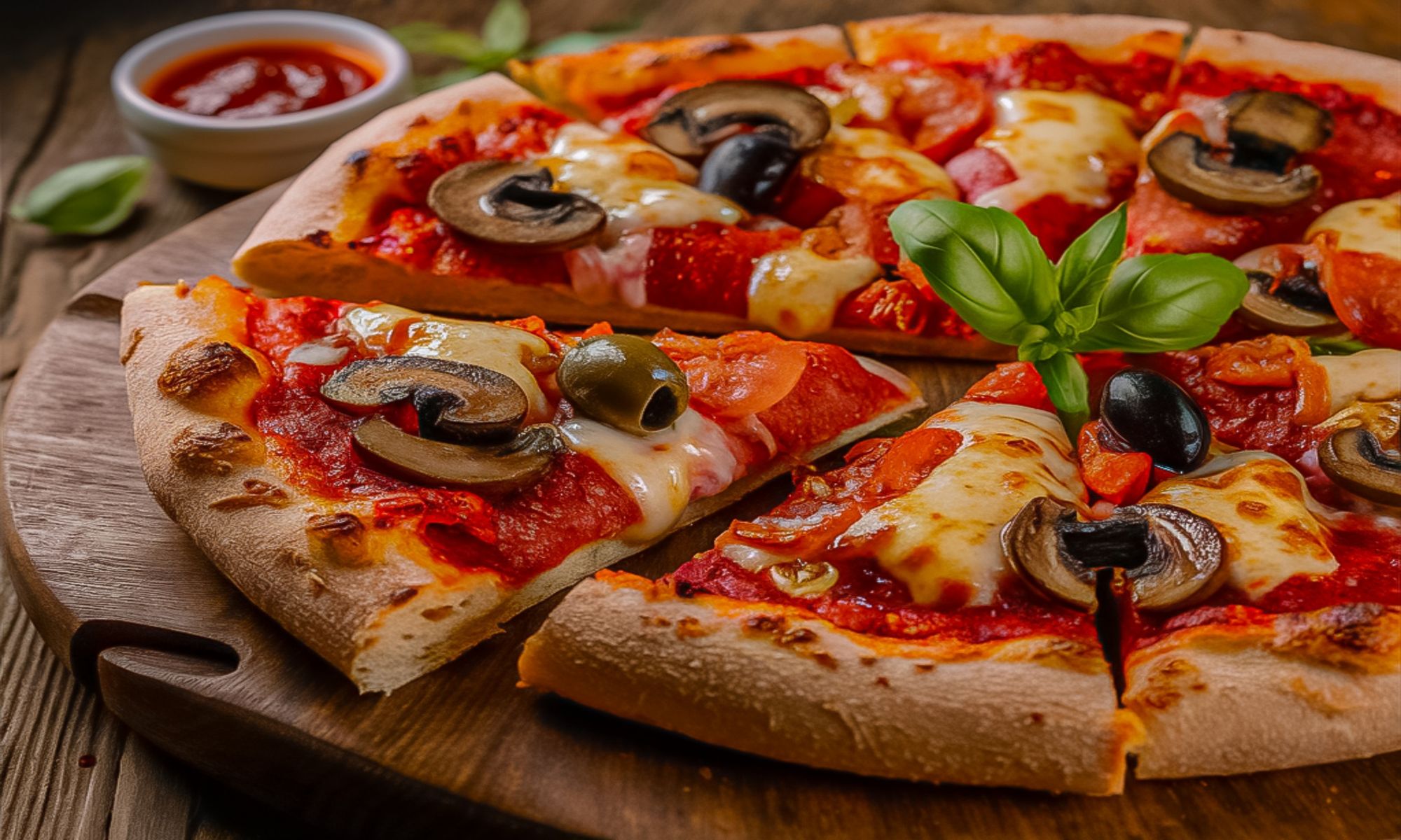 Pomodoro, mozzarella di bufala, prosciutto cotto, pomodorini, olive, salame piccante, funghi, scagli di grana e origano