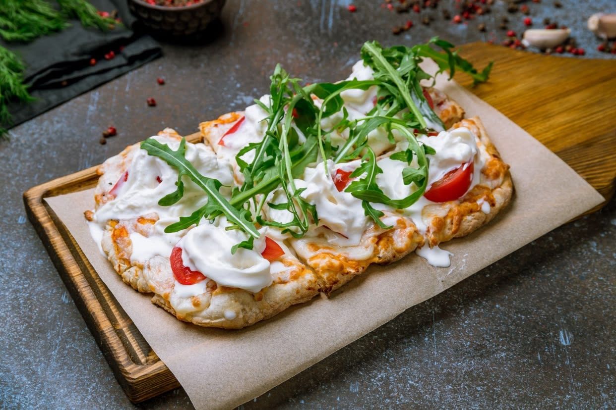 Base pinsa, friarielli, pomodori secchi e stracciatella