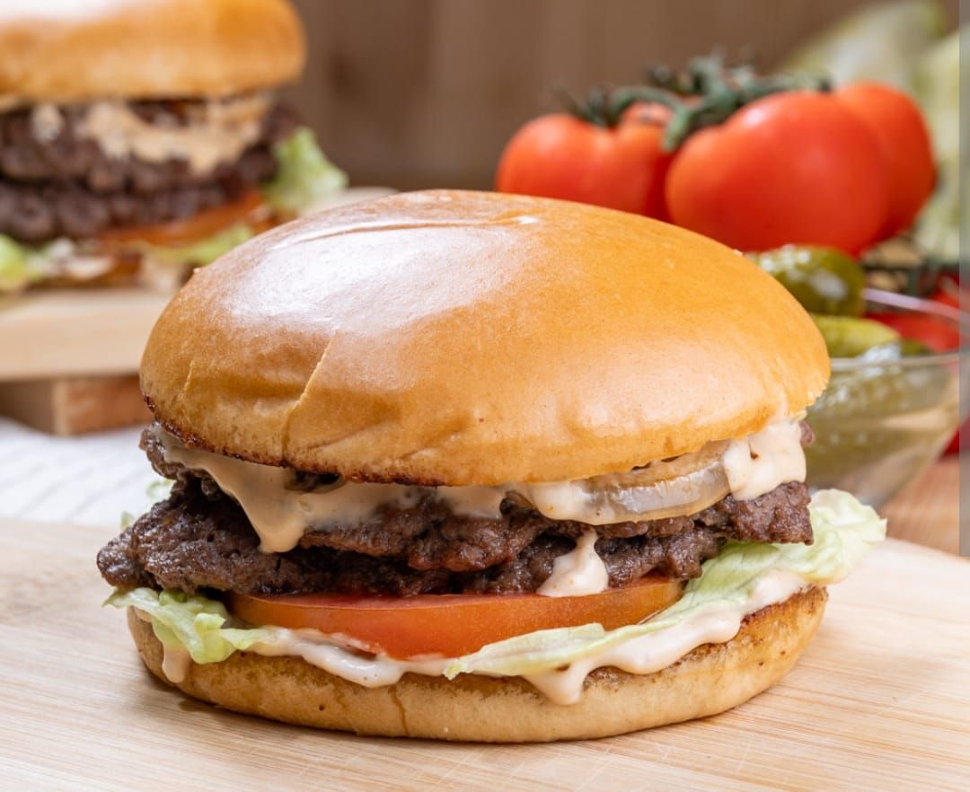 Panino con due hamburger completo di sottilette burger ketchup maionese e patatine