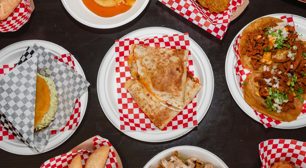 focaccina di mais ripiena di formaggio fresco, platano, fagioli neri e avocado.