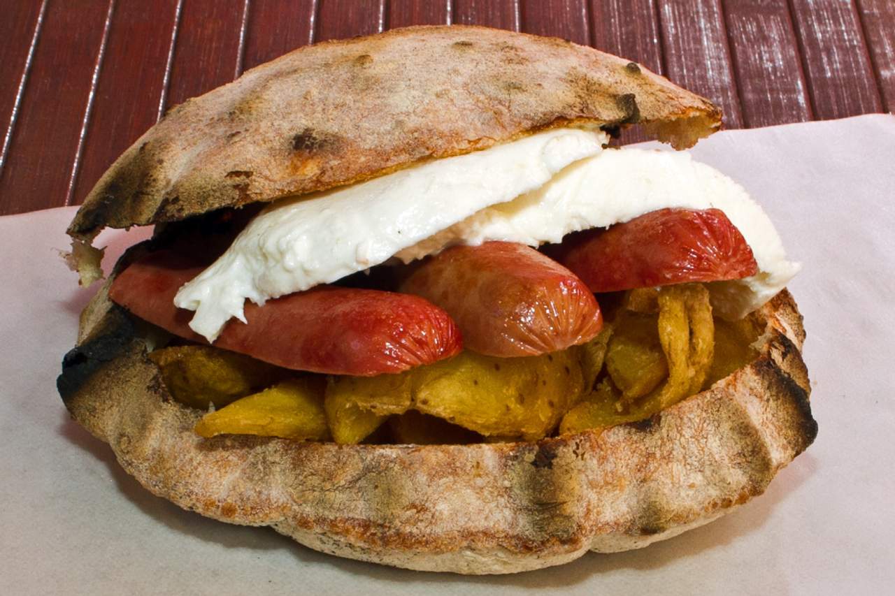 Con mozzarella, wurstel, patatine fritte e salsa a scelta