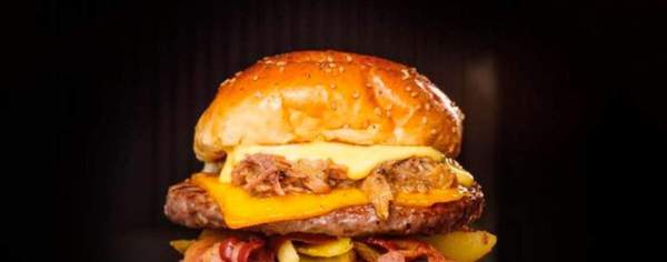 Bun artigianale, hamburger, bacon, cheddar, patate fritte, pulled pork e fonduta di cheddar