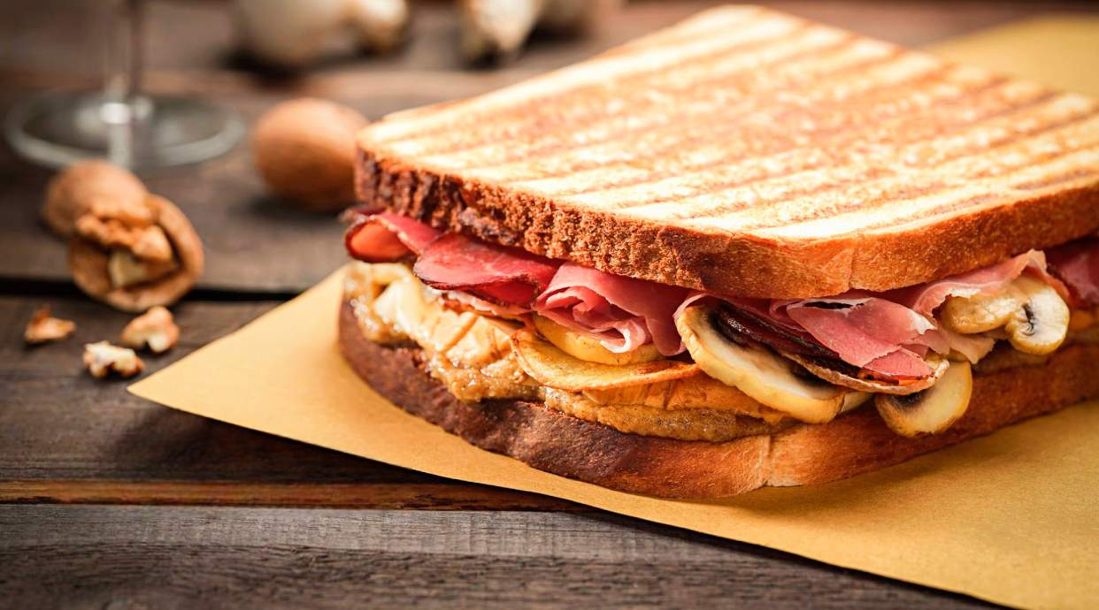 3 Piani con bacon, american cheese, uova strapazzate, prosciutto cotto coati, insalata, pomodoro, maionese