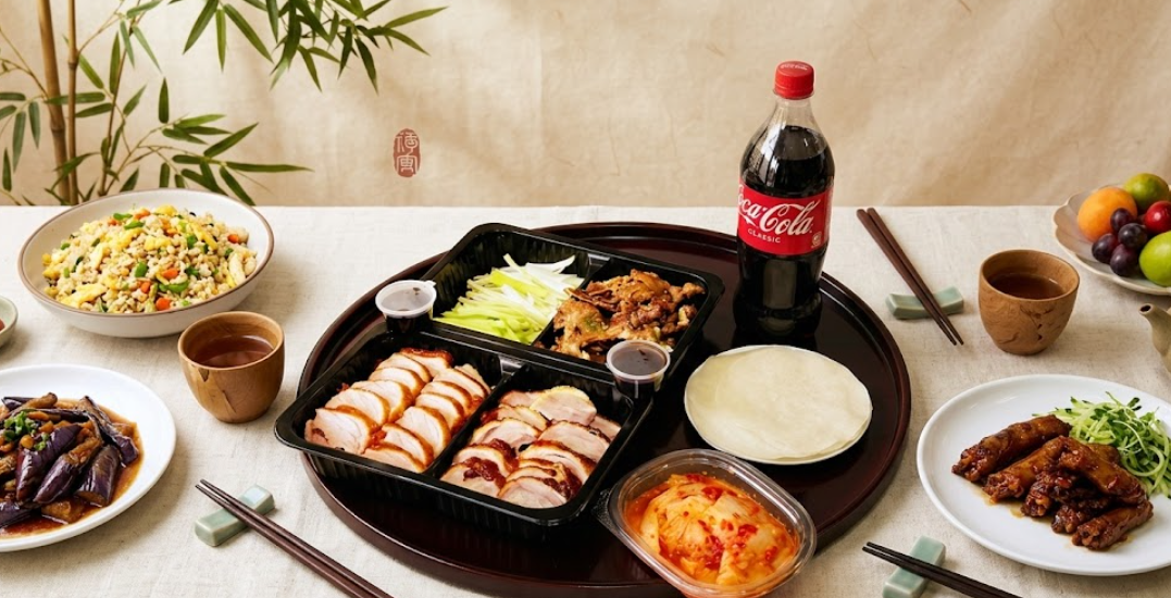 Филе и мясо половины утки, обжаренные на масле косточки, лепешки, огурец и лук-порей, нарезанные соломкой, фирменный соус.