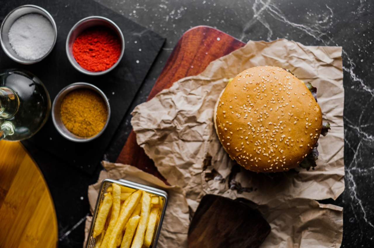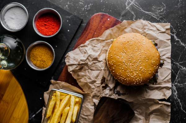 Карамелизированная булочка посыпана кунжутом с 2-ой сочной котлетой из мраморной говядины, с 2-ой пластинкой сыра чеддер ,свежие овощи и 3 фирменных соуса от Шефа