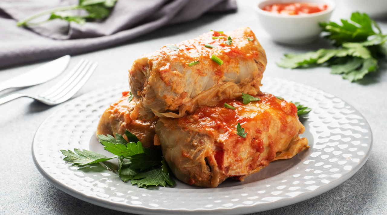 Капуста, мясной фарш, рис, томатный соус, специи.