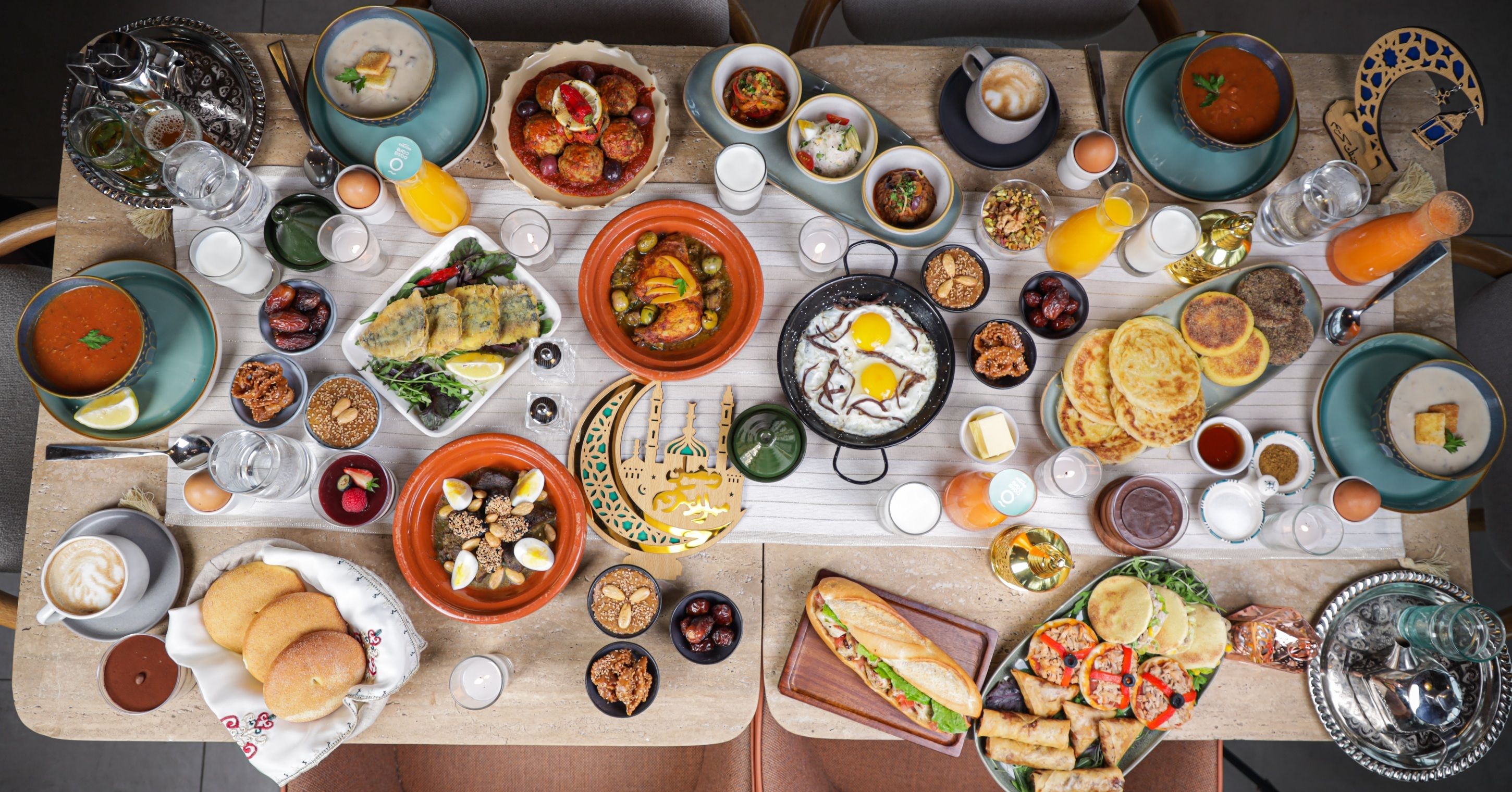 Harira ou soupe asiatique, œuf dur, les incontournables : dattes, chebakiya, sellou, lait, eau minérale 33cl, boisson chaude au choix, jus d’orange ou jus de carotte, 2 mini msemen, 2 mini harcha, beurre et miel, tajine ou grillade au choix, dessert au choix