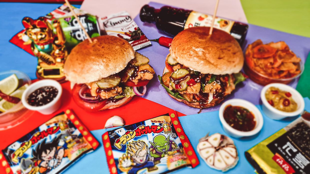 Bułka, sos red thai, sałata rzymska, kimchi, ser mazdamer, stripsy, sos korean BBQ, ogórek konserwowy, papryczka piri piri, kolendra, sezam