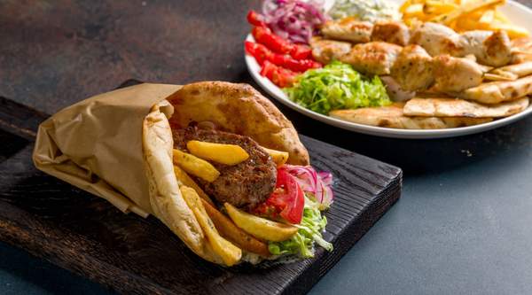 100g mięsa, frytki, sałatka grecka, sos *zdjęcie poglądowe