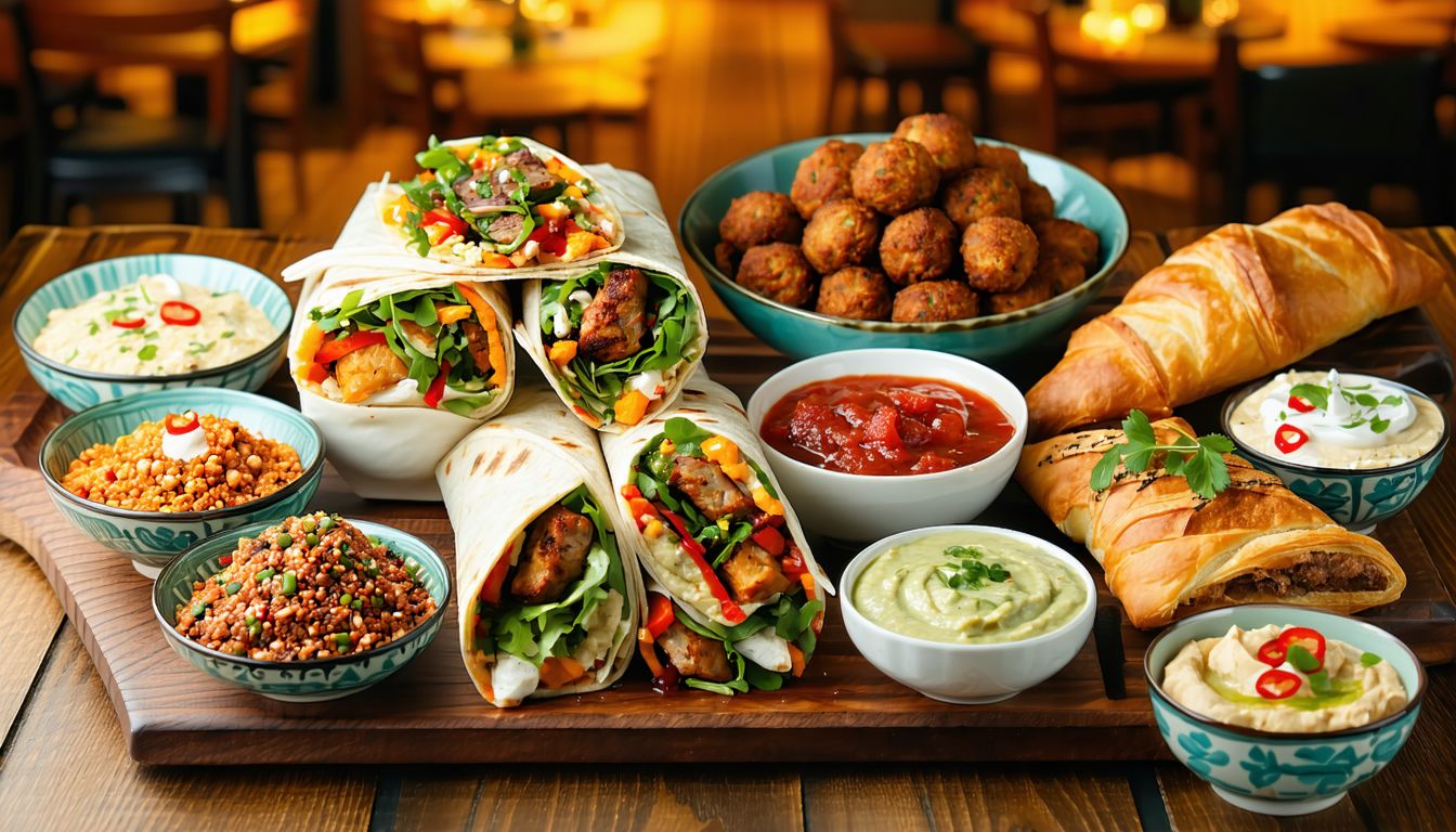 zestaw bliskowschodnich przekąsek: falafele, kofta libańska 100g, harissa, hummus w 3 smakach, oliwki (z pestką), sos jogurtowo-miętowy, paski marchewki i ogórka, sałatka wegetariańska i 2 pity. Porcja 910g