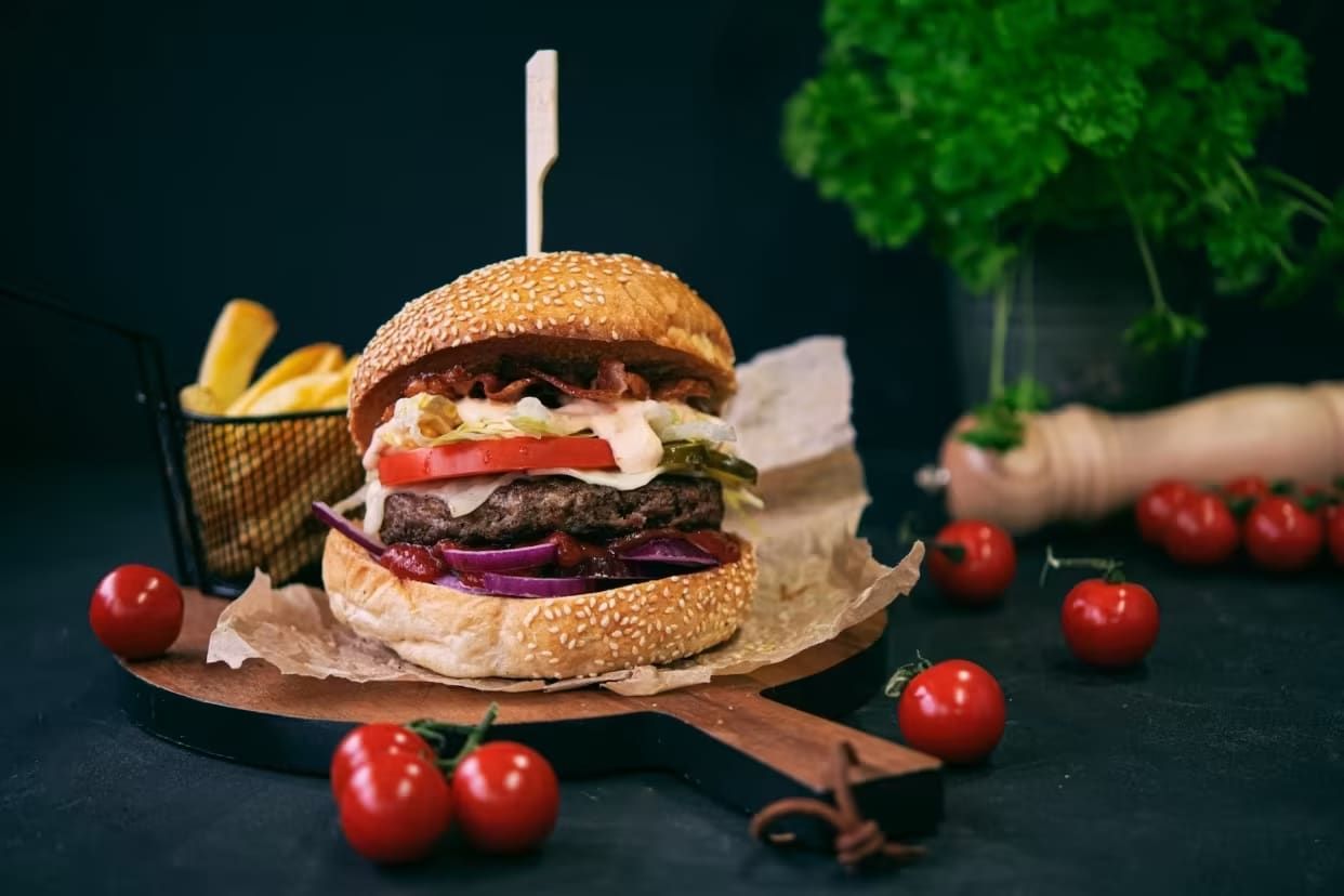 Stek 130g lub 200g, ser, grillowany boczek, cebula red, sałata lodowa, pomidor, ogórki kiszone, sos firmowy