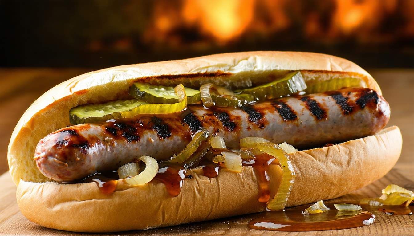 Duża kiełbasa z rusztu, chleb, ogórek