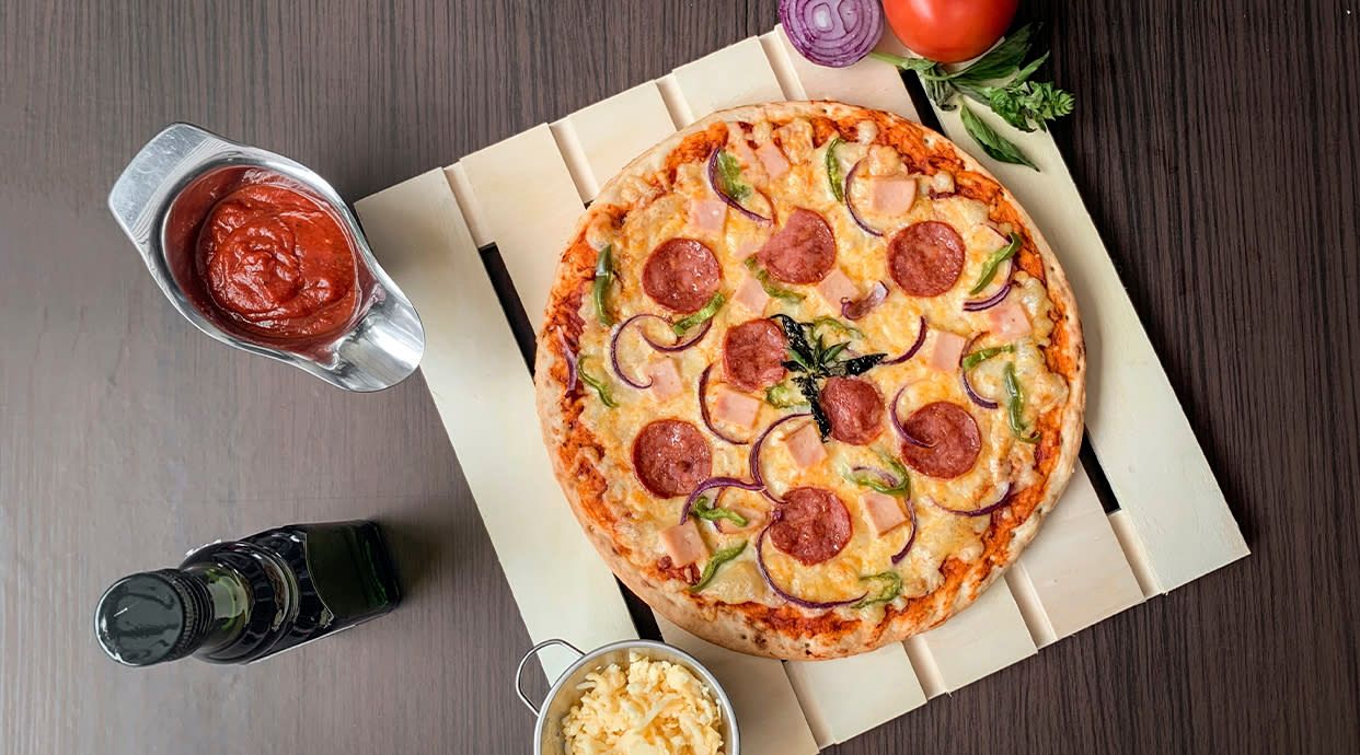 Z boczkiem, kiełbasą, pieczarkami, kukurydzą, cebulą i zielonymi oliwkami