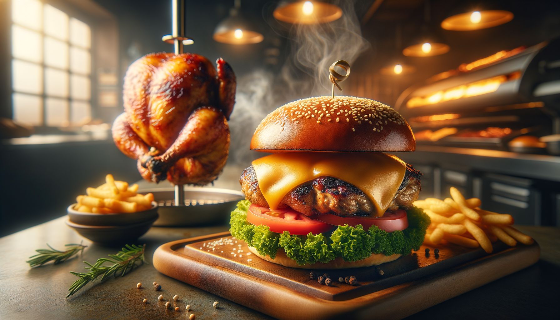 Bułka, sałatka, ogórek kiszony, ser mozzarella, pomidor, cebula prażona, pieczarki smażone, sos czosnkowy, kurczak z rożna