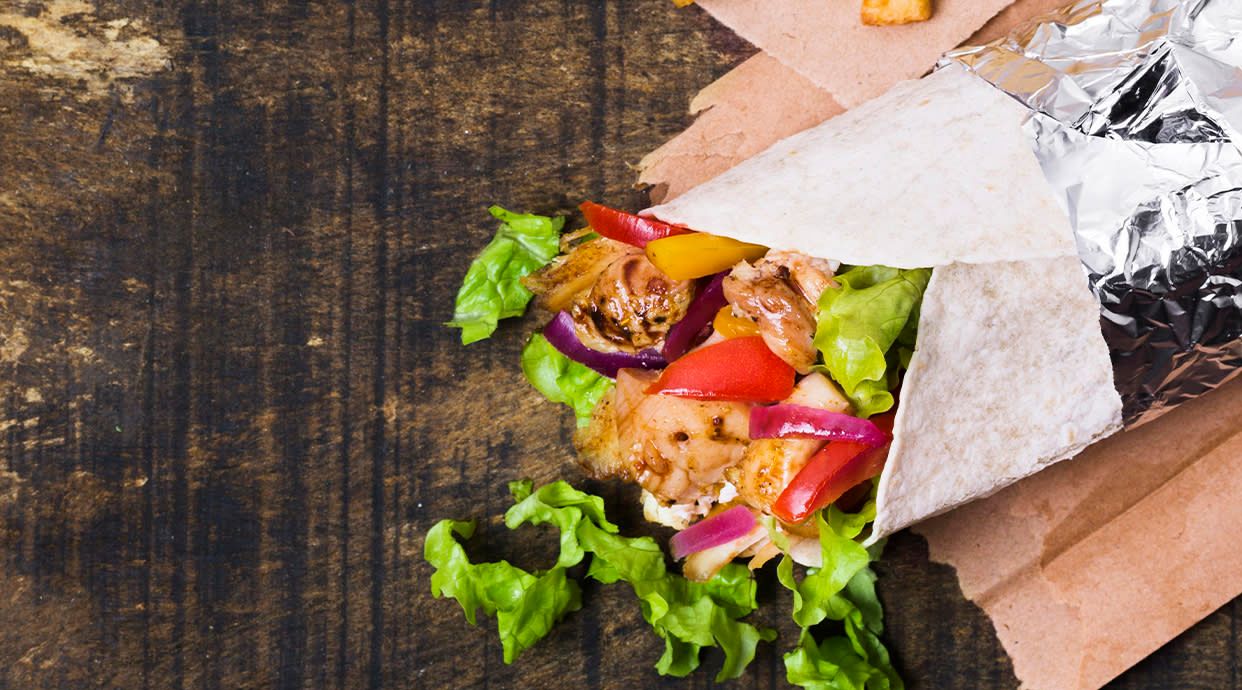 Cienki chleb pita, pieczone mięso, surówka, ogórek, pomidor, sos, pasta czosnkowa