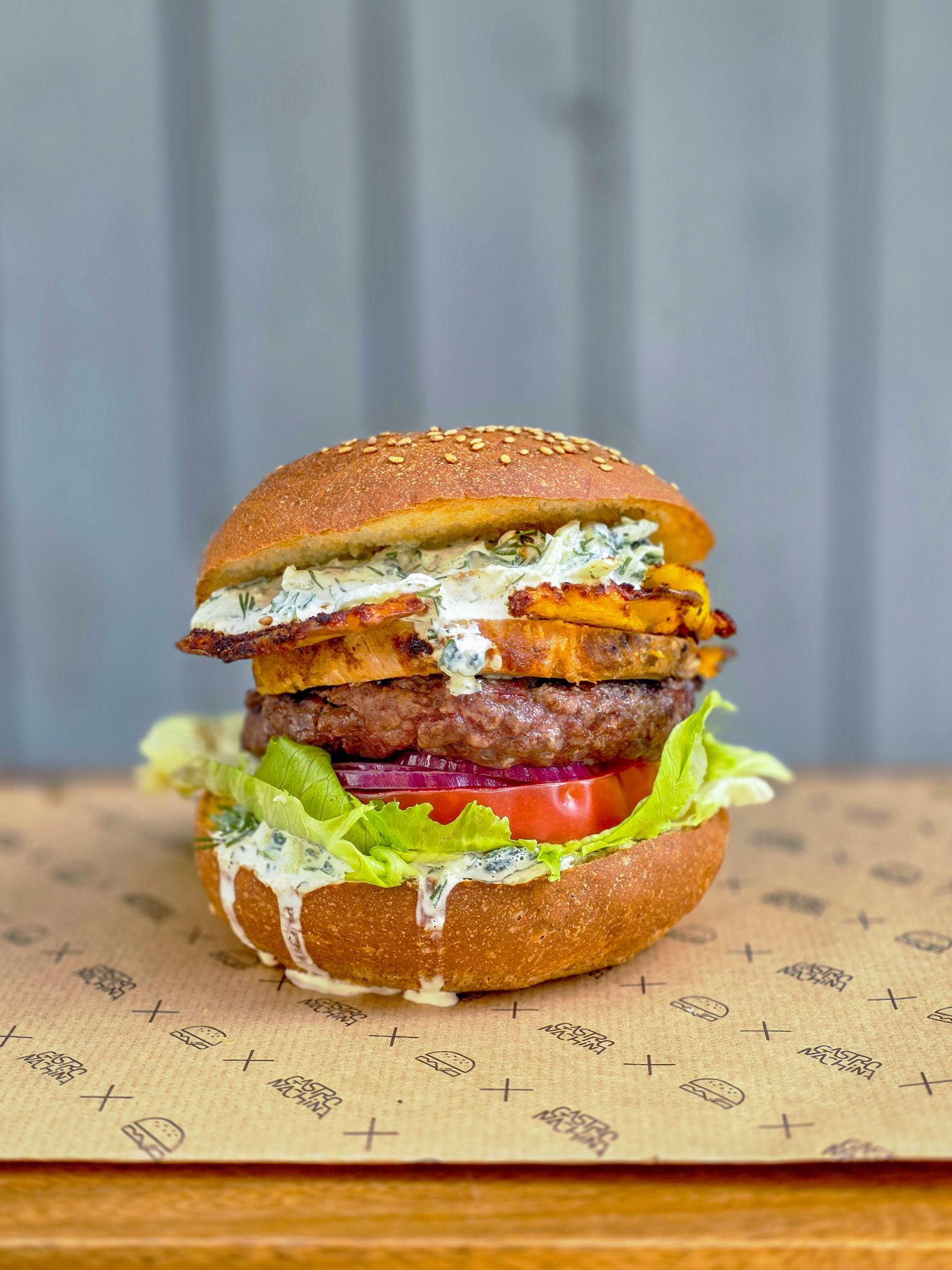 150g wołowiny, ser kozi, spicy mango, cebula czerwona, pomidor, sałata, sos, bułka