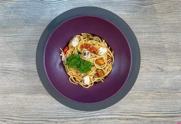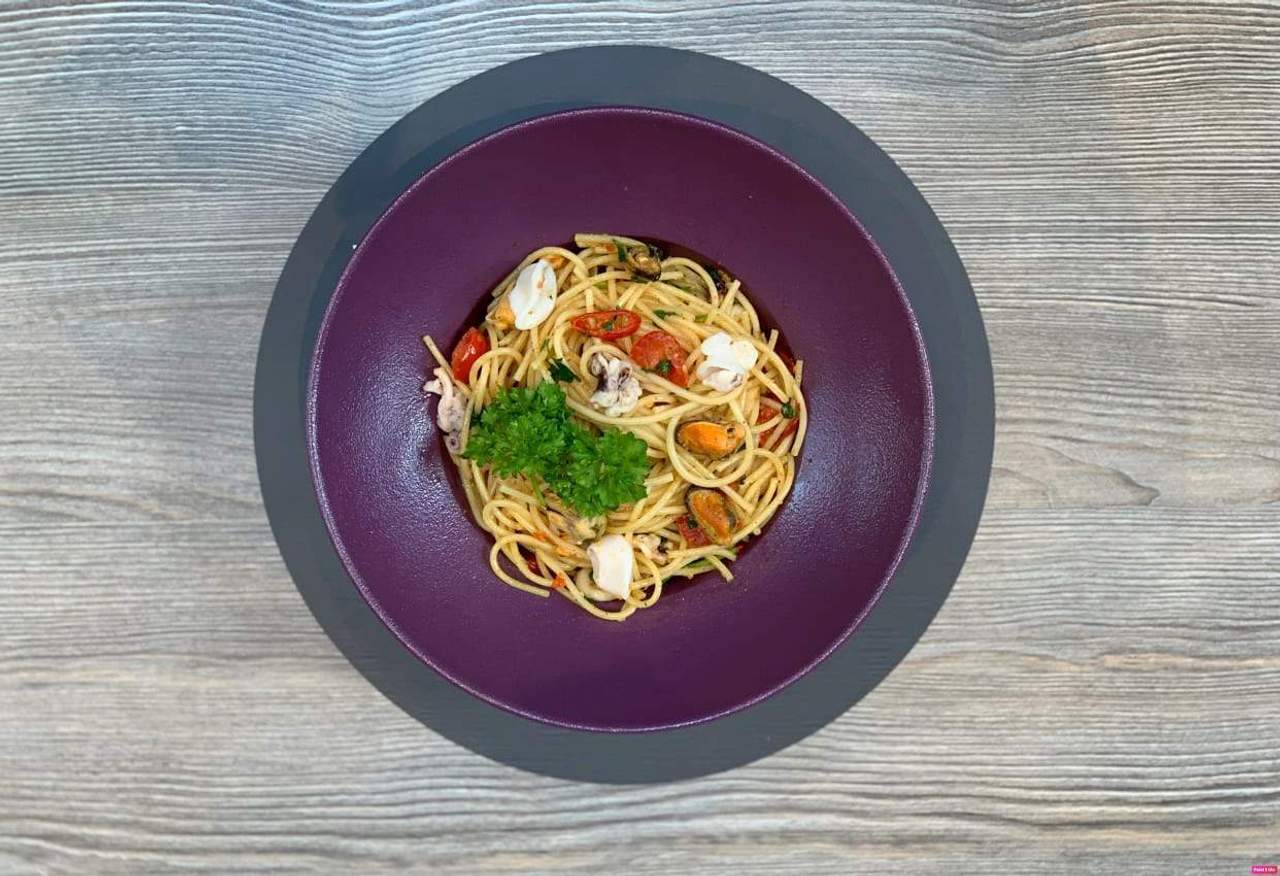 Frutti di mare, masło, czosnek, peperoncino, pomidorki koktailowe, natka