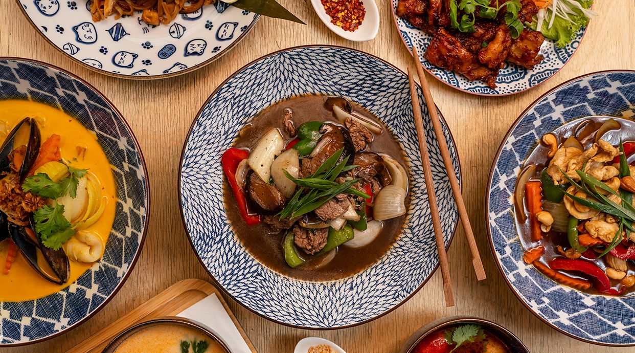 Zielone curry wołowiną z papryką, bakłażanem, bazylią, chilli, serwowane z ryżem jaśminowym.