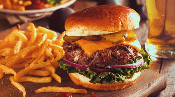 100% wołowina z sosem białym, piklami z ogórka, cebulą czerwoną, sałatą, frytkami i surówką colesław