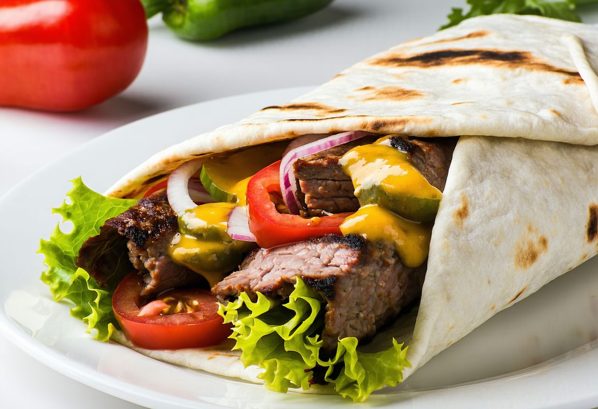 Około 220g mięsa, pita arabska, kapusta czerwona, sałata lodowa, pomidor, ogórek, cebula, sosy