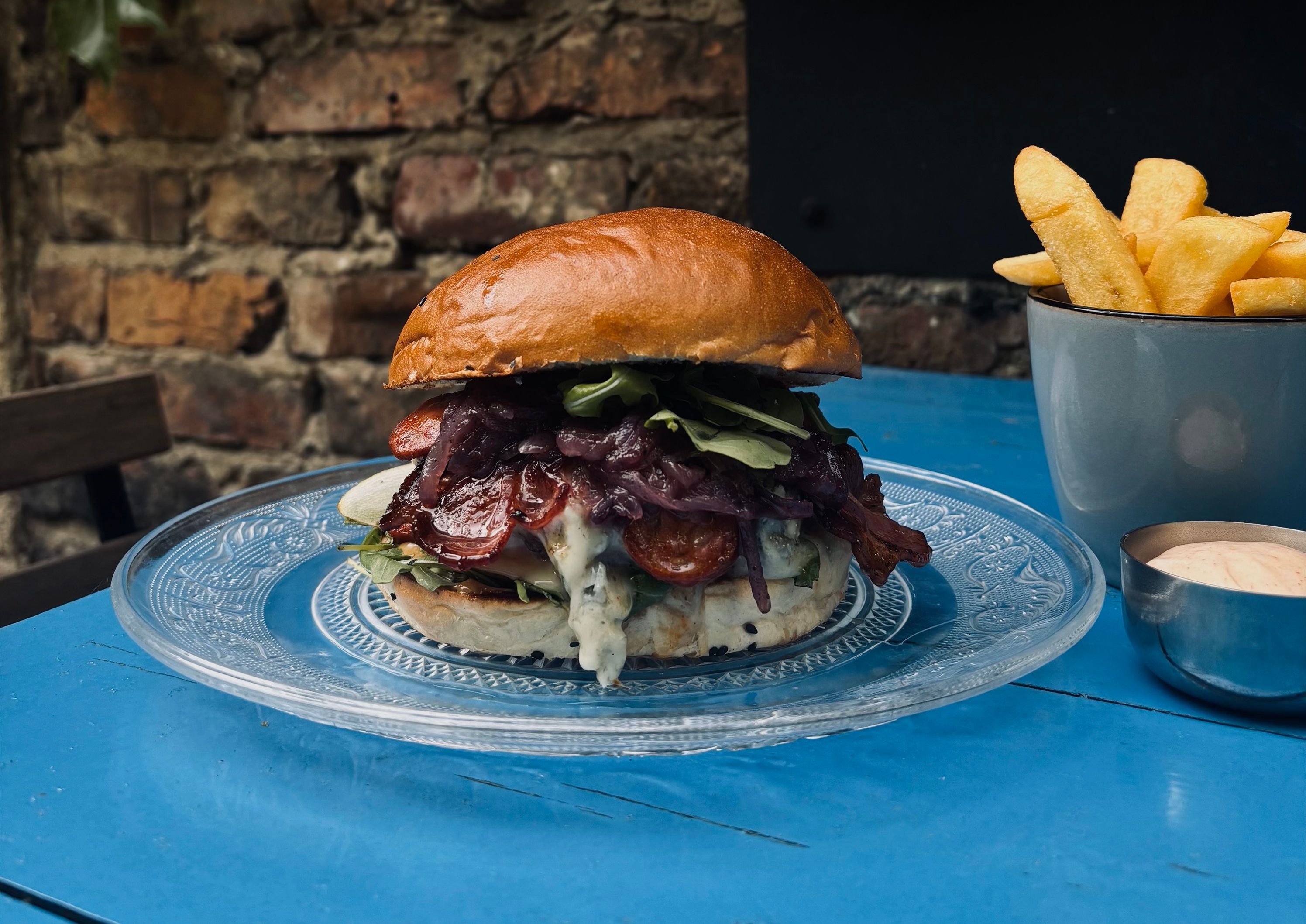 Bułka pszenno-mleczna, 180g wołowiny nadziewanej błękitnym lazurem, cheddar, boczek, jalapeno, chutney z cebulki, rukola, sos korzenny