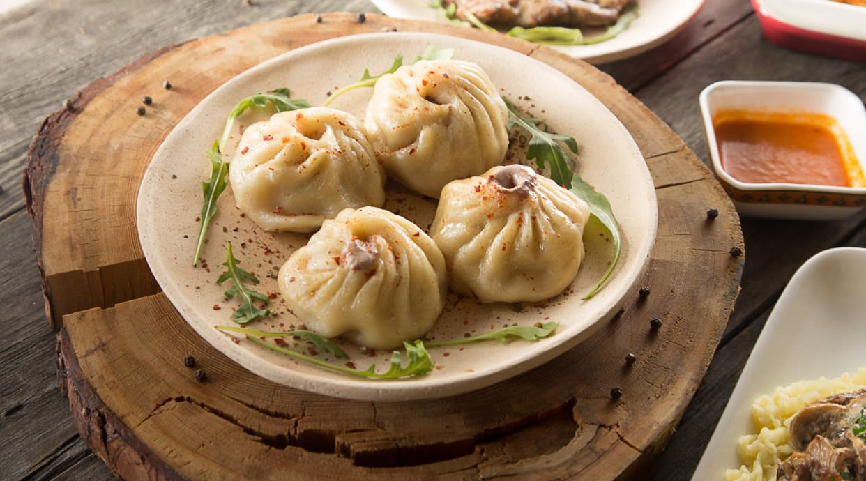 Pierożki z mąki pszennej, gotowane na parze, zestaw różnych pierożków w koszyku