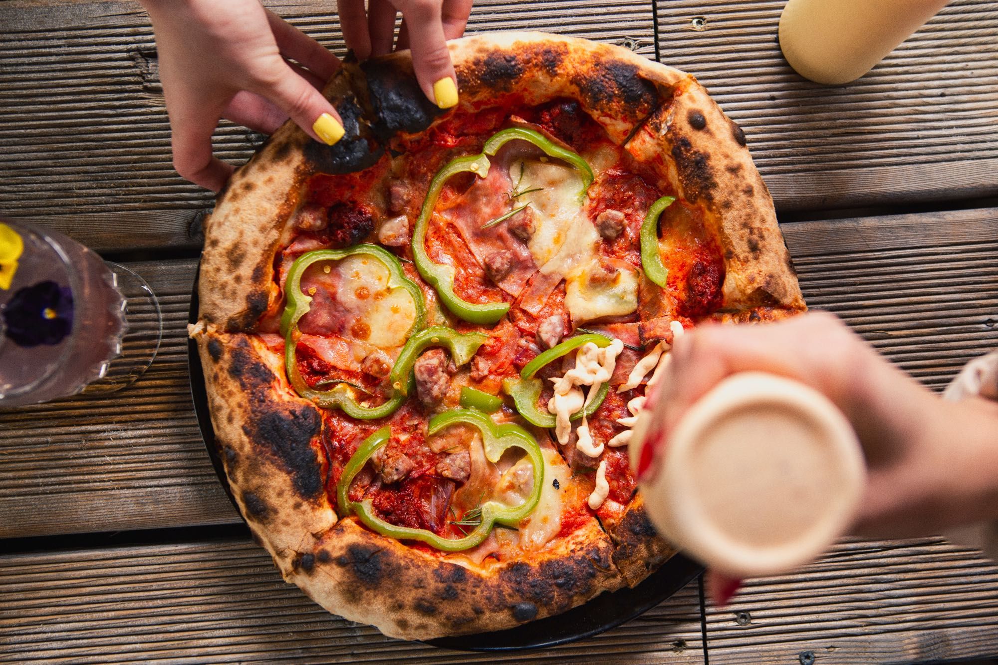 sos z włoskich pomidorów, mozzarella fior di latte, cebula czerwona, salami spianata, nduja, mascarpone, bazylia tajska
