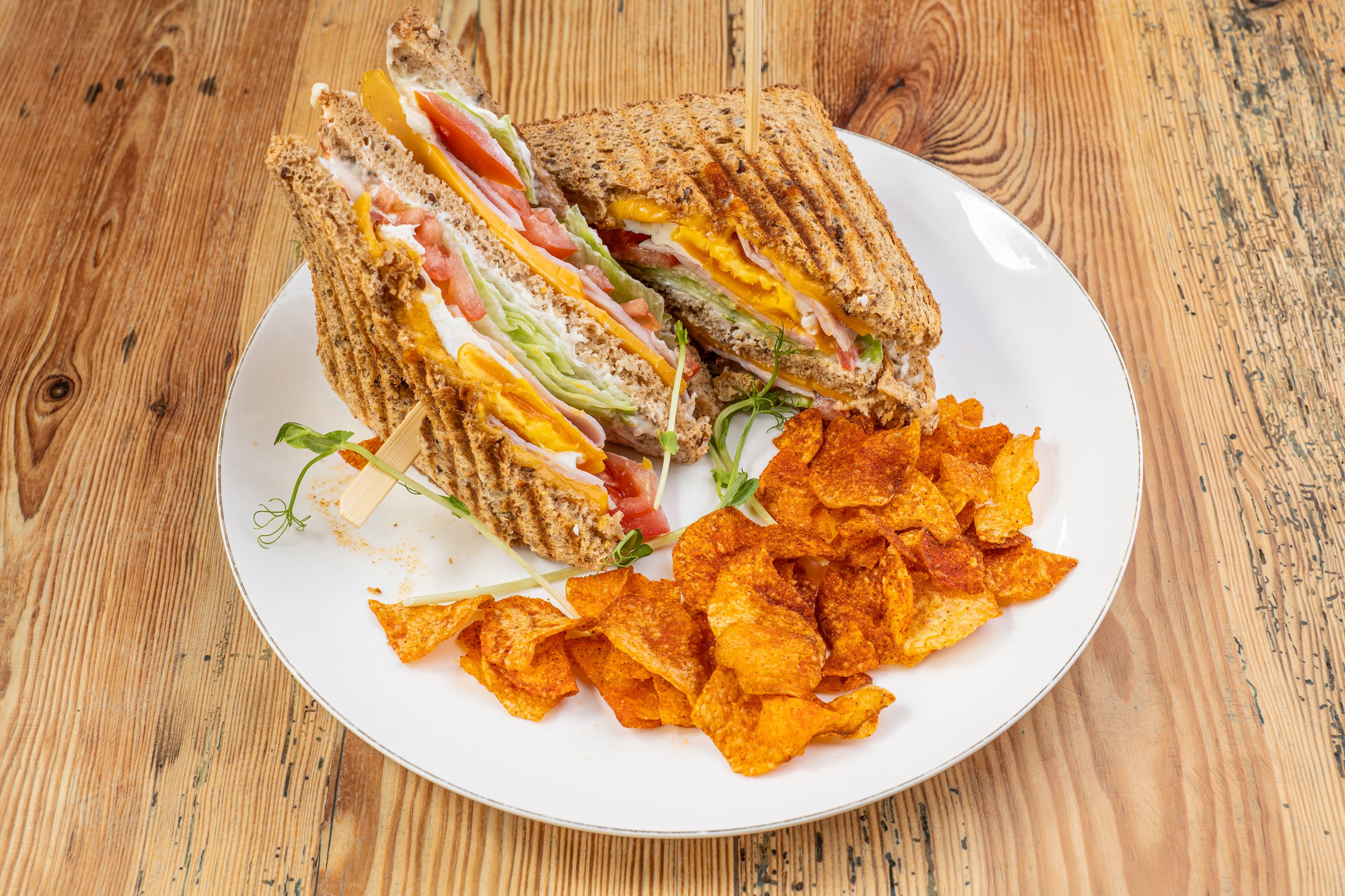 Z grillowanym kurczakiem, chrupiącym bekonem, pomidorem, jajkiem, grana padano, sałatą rzymską i grzankami bazyliowymi