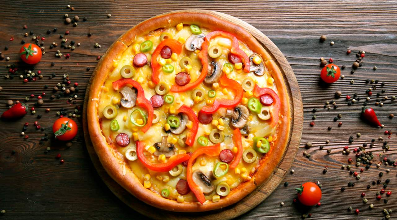 Ser, sos, kiełbasa, boczek, szynka, pieczarki, papryka, ogórek kiszony, kukurydza, oregano