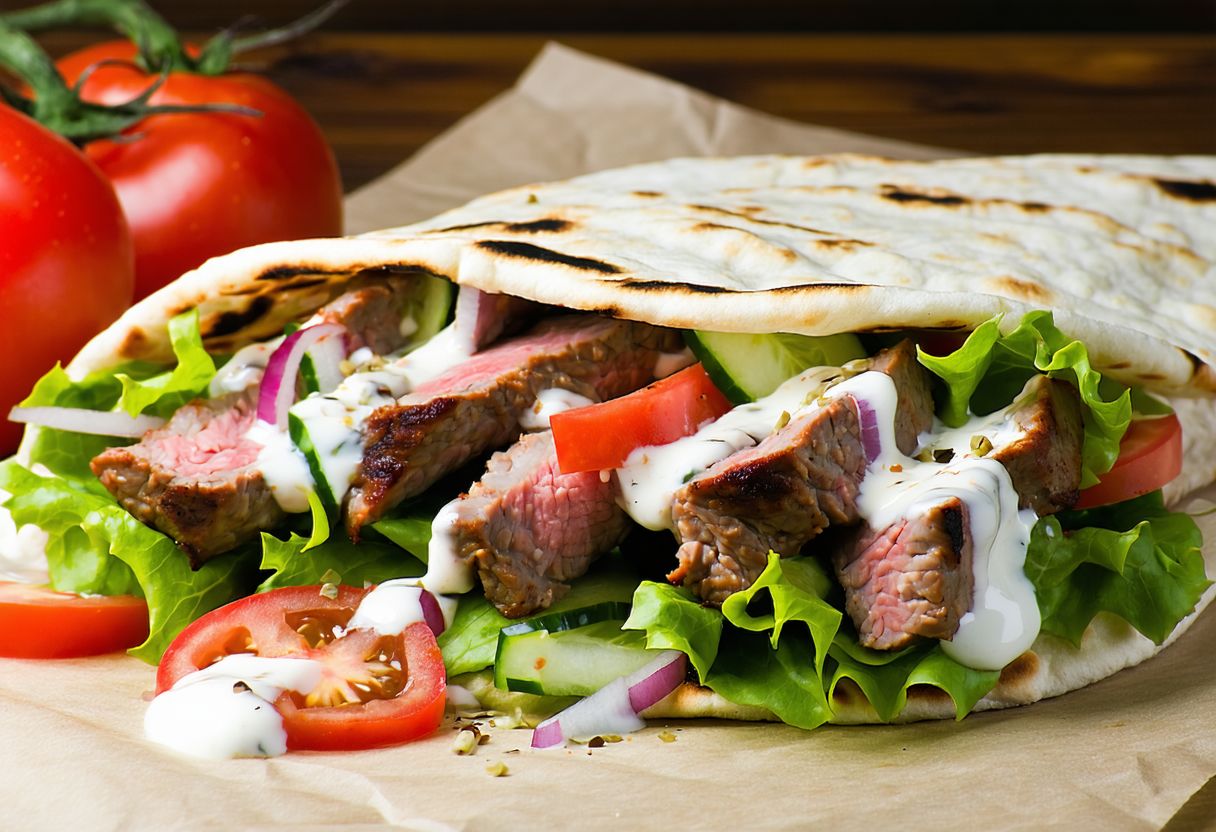 Chleb pita, sałata lodowa, marchew, roszponka, ogórek kiszony, cebula czerwona, mięso wołowe, drobiowe, falafel, sos *zdjęcie poglądowe