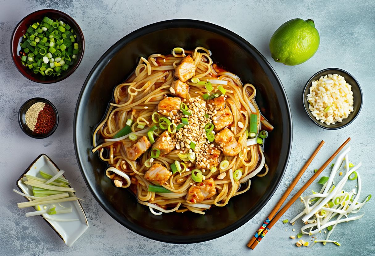 Zestaw surówka , makaron ryżowy , krewetki warzywami i sos pad thai