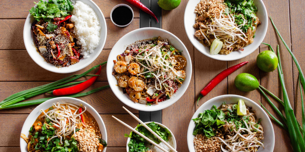 smażony na woku makaron ryzowy z jajakiem, czerwoną cebulą, kiełkami fasoli mung, orzechami i kolendrą