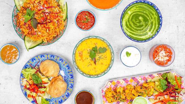 Indyjski ryż basmati z kawałkami piersi kurczaka zamarynowanego w aromatycznych przyprawach indyjskich, z orzechami nerkowca i rodzynkami, serwowany z cząstkami jajek na twardo i sosem jogurtowym Raita, zdjęcie poglądowe
