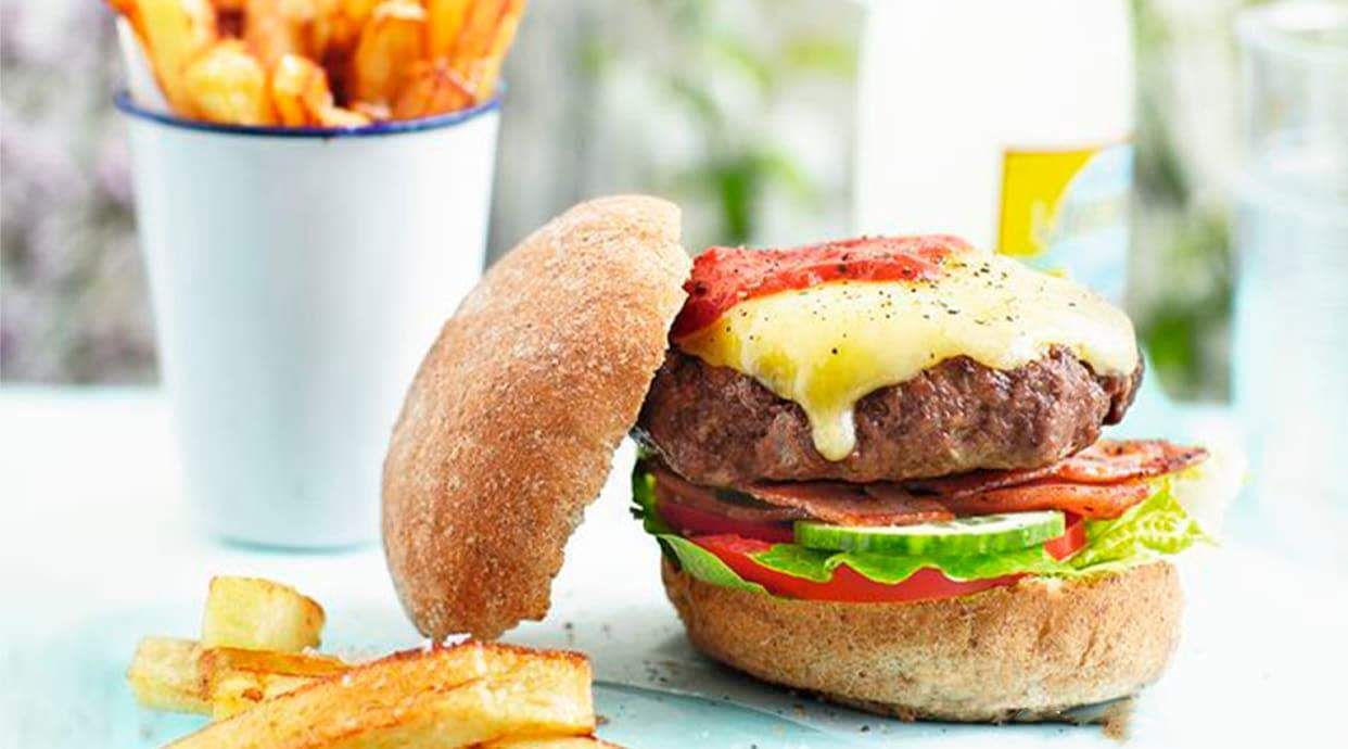 200g wołowiny, domowe fryty do środka burgera, 2x ser mimolette, 2x bekon, papryczki red jalapeno, pomidor, sałata, karmelizowana cebula, sos bbq louisiana, buła maślana z sezamem
