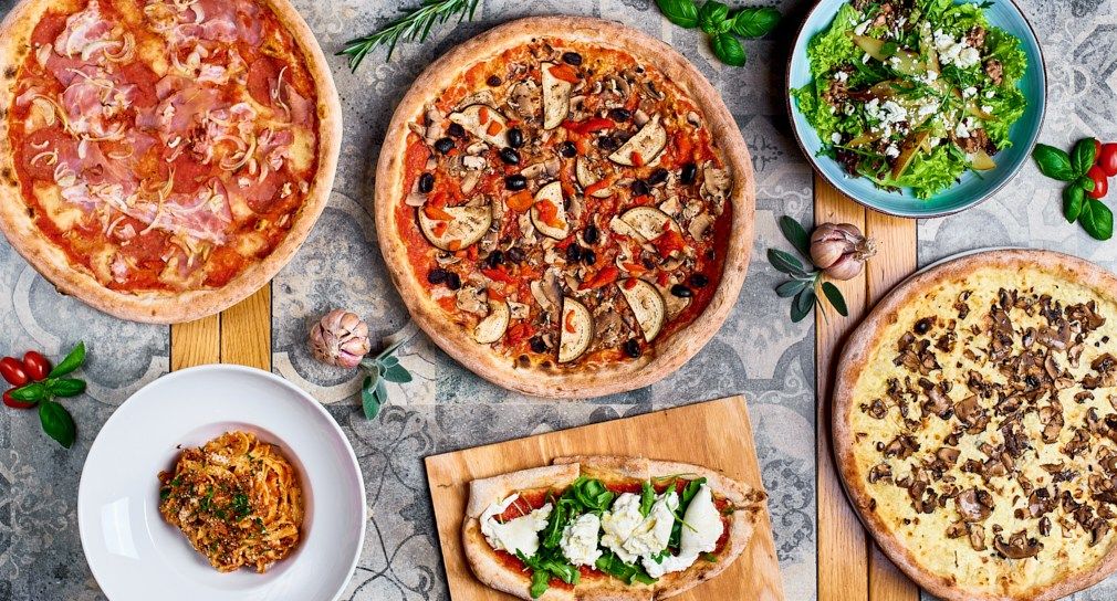 Sos pelati, Mozzarella, szynka Cotto, pieczarki, oliwki, papryka pieczona, karczochy. Rodzaj ciasta i sera do wyboru. Cena zawiera koszt opakowania.