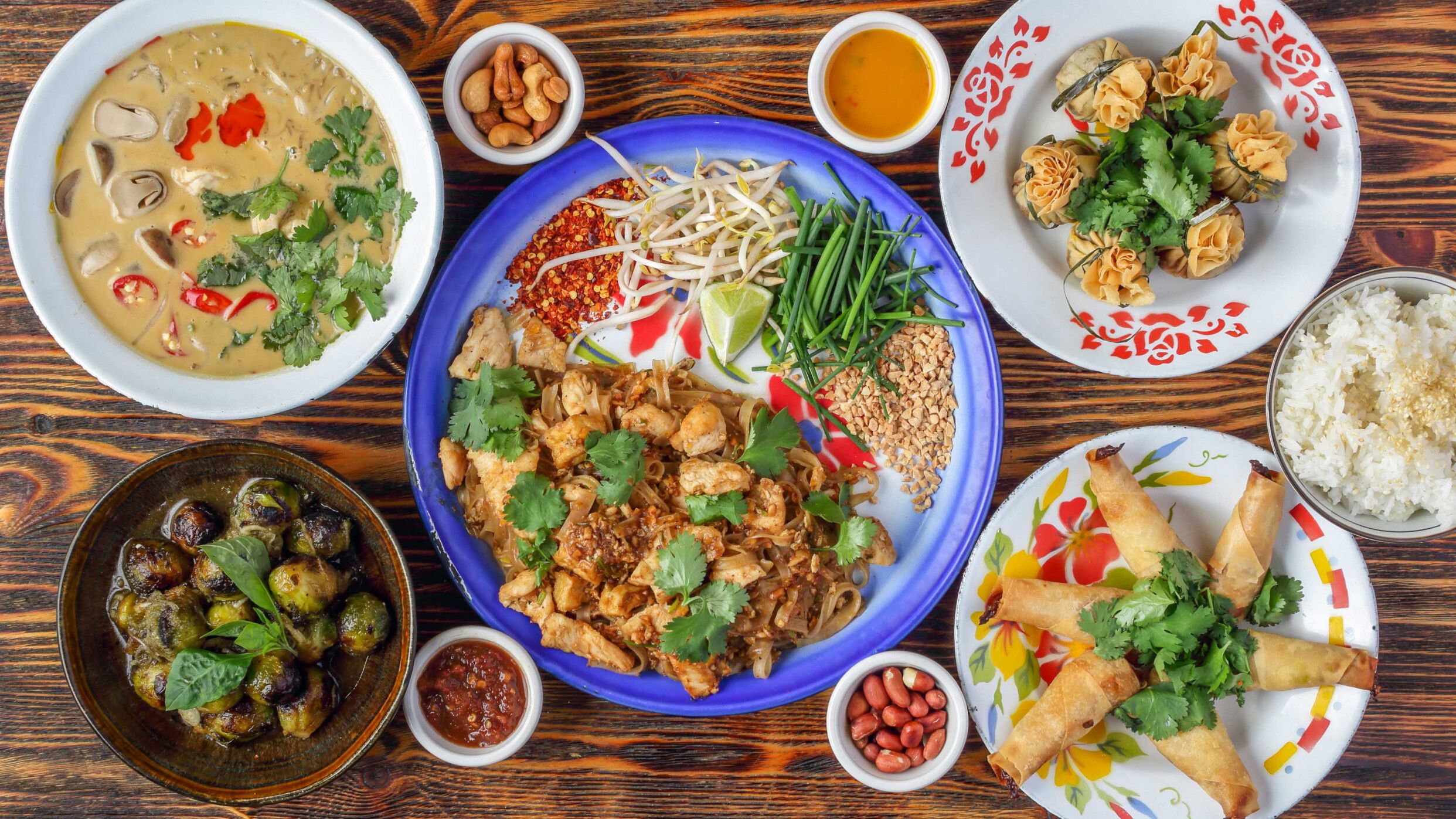 Klasyczny pad thai w wersji wegetariańskiej – przygotowywany na woku makaron ryżowy połączony z aromatycznym sosem na bazie tamaryndowca i limonki. Podawany z tofu, kiełkami mung i szczypiorkiem, świeżą kolendrą, chilli grysem oraz chrupiącymi orzechami.