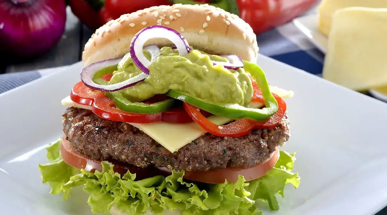 Wołowina, bułka, sos francuski, sałata, cebula, ogórek, ser, pomidor