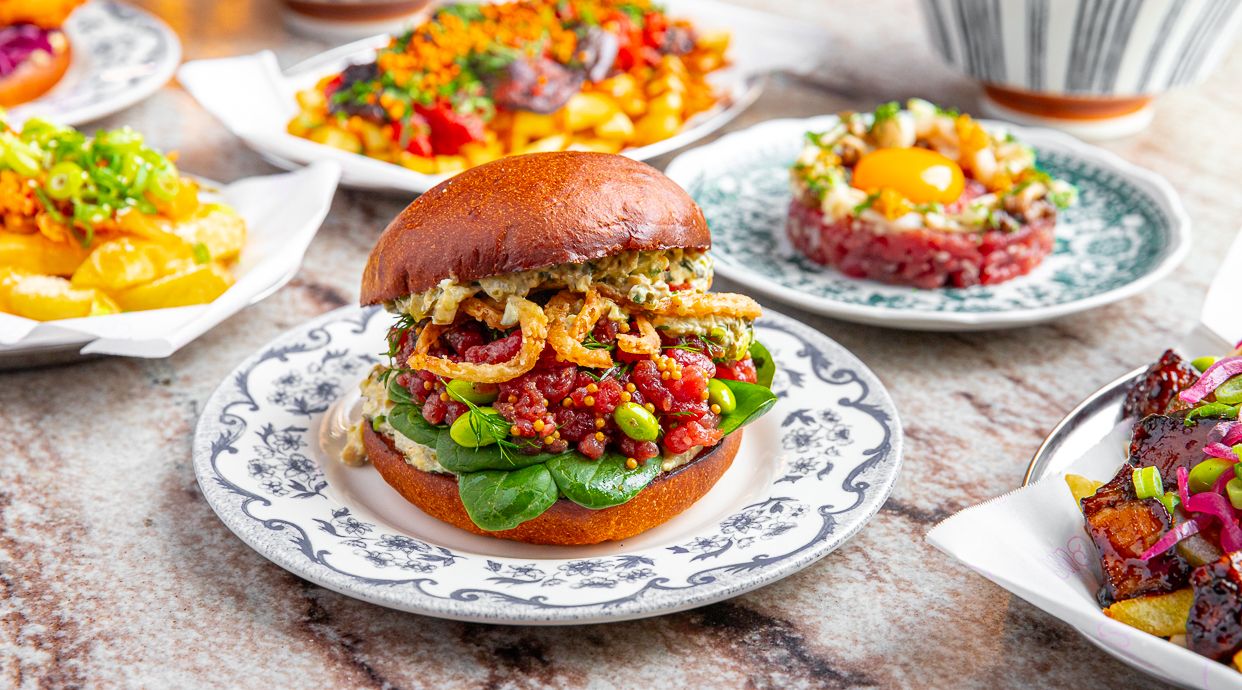 maślana brioszka, ligawa Highlander, domowy sos tatarski, edamame, gorczyca, prażona cebulka, baby szpinak, niboshi, koperek