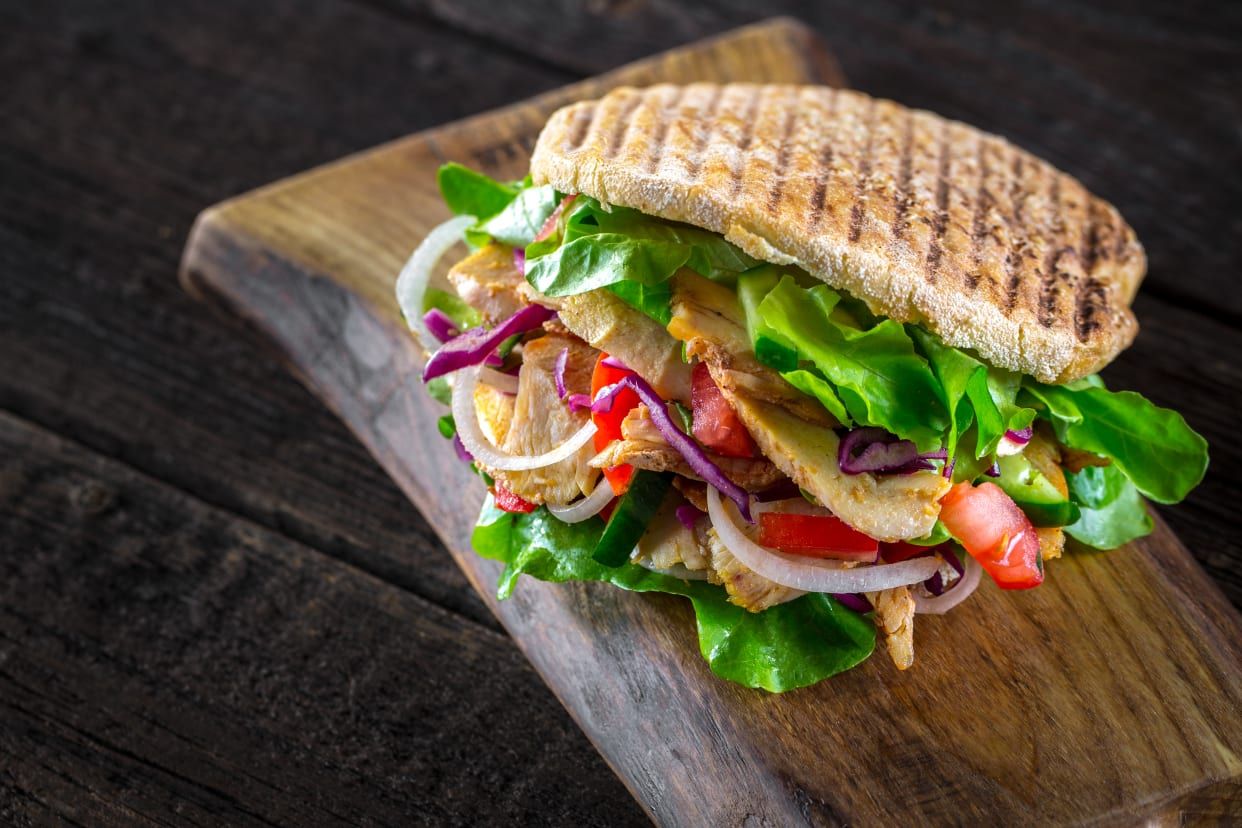 Chlebek 60g, warzywa 130g, kebab drobiowy 110g, sosy 50g