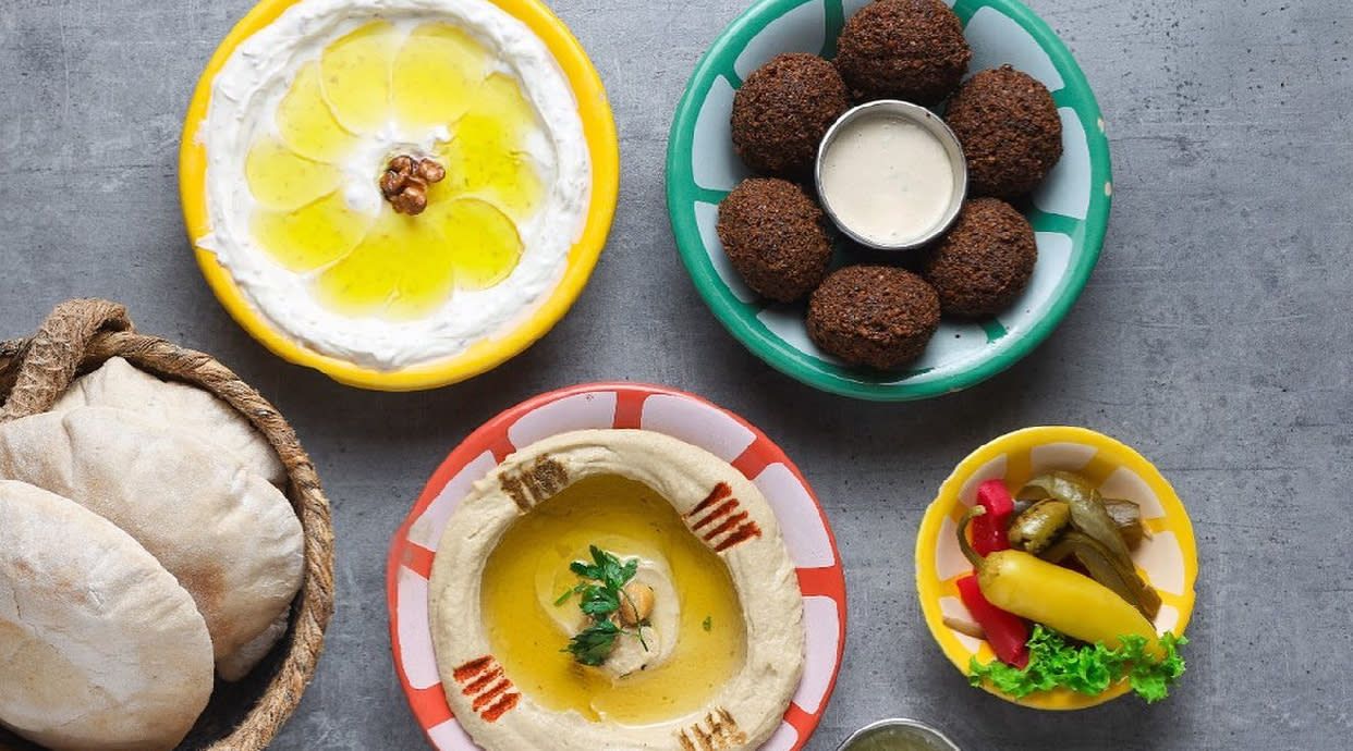 Falafel, labaneh z zaatarem, mfarrakeh podawane z 4 chlebkami pita