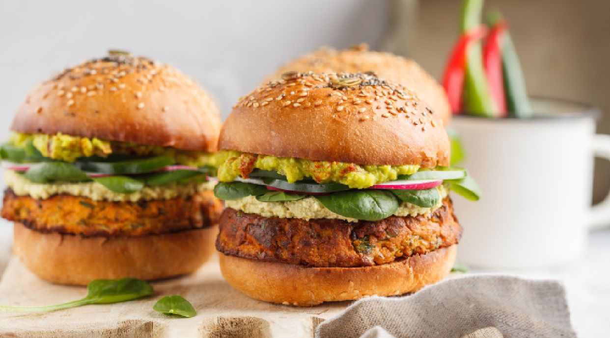 Burger z polenty, rukola, roszponka, kiełki rzodkiewki, pomidor, mozzarella, burak, gruszka, sos gorgonzola