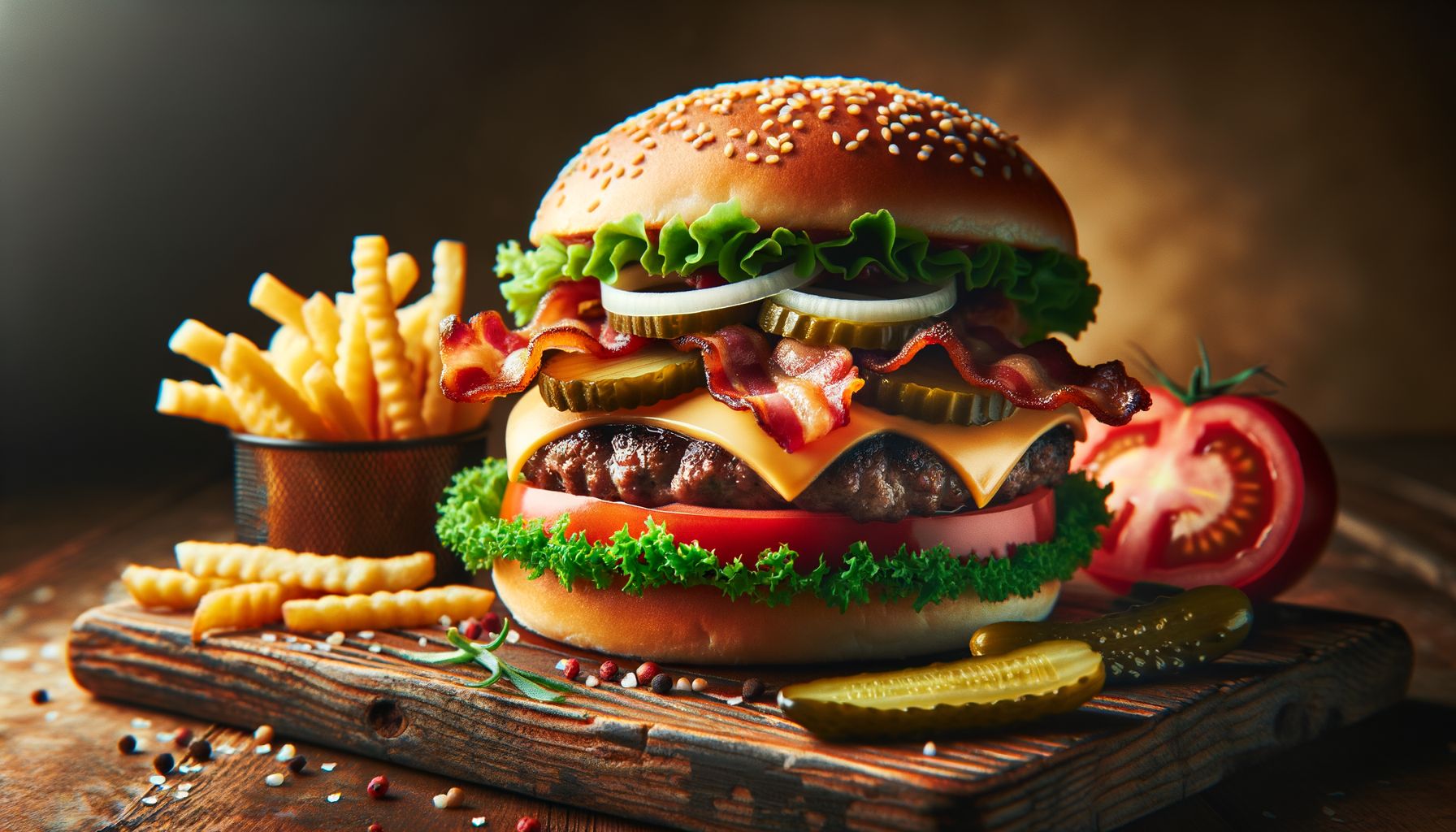 bułka brioche, grillowana wołowina (150g), ser, pomidor, ogórek konserwowy, frytki, ketchup
