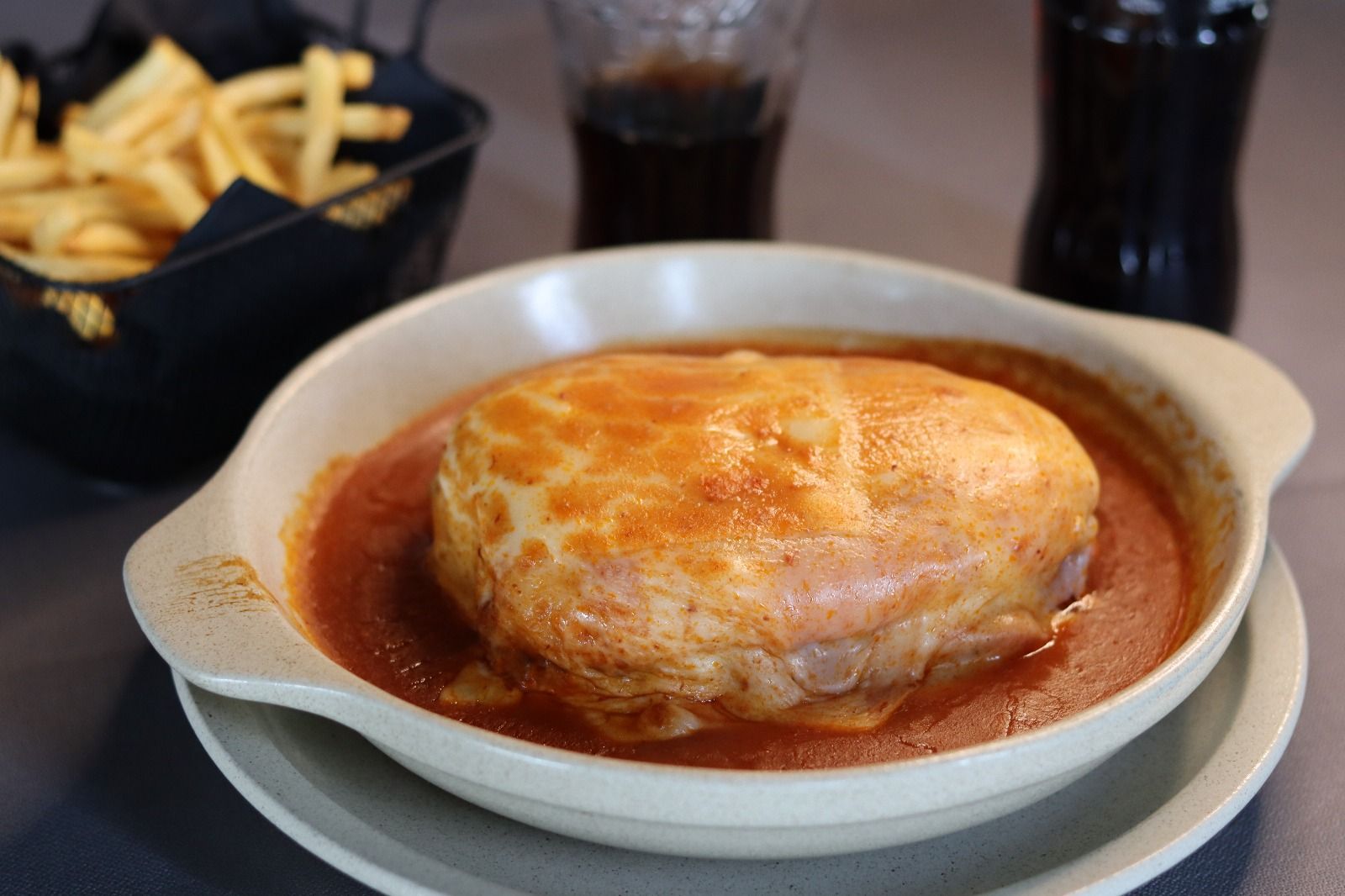 Pão, hambúrguer, chourição, fiambre, tomate, queijo e molho de francesinha. Acompanha com batata frita