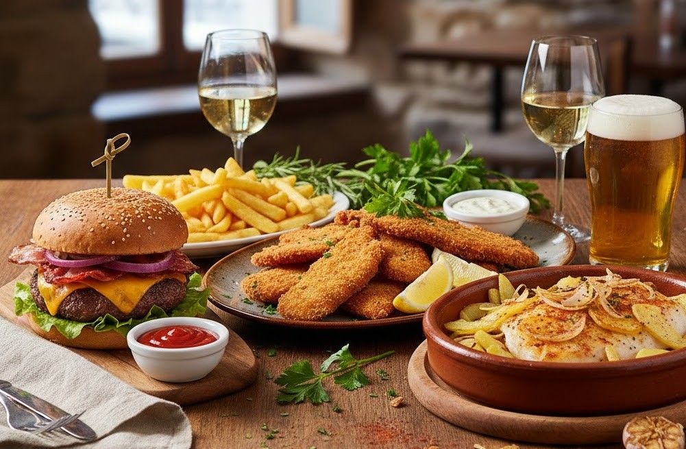 Filetes de pescada fritos até ficarem dourados e crocantes, servidos com arroz de legumes e salada fresca. Um prato leve, saboroso e muito apreciado