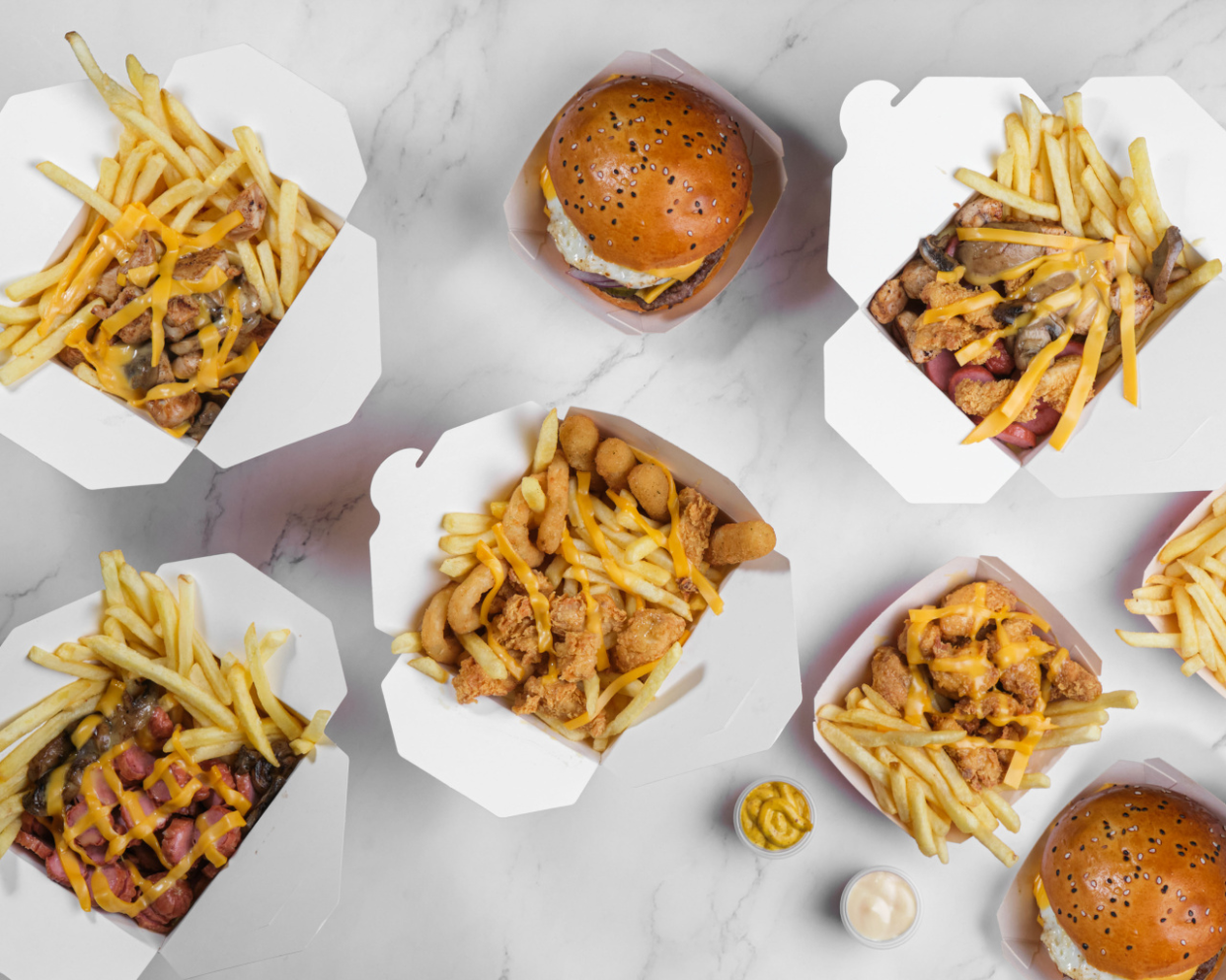Batata frita, molhos, salsicha, cogumelo e queijo