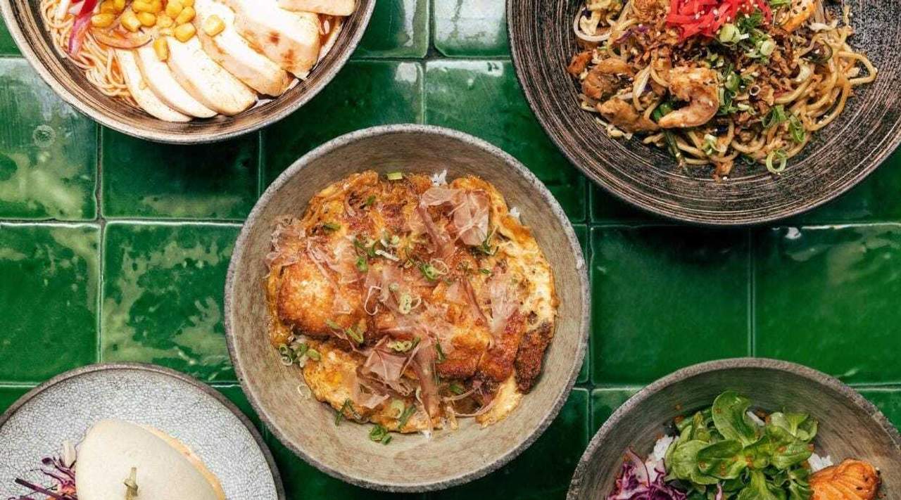 Nooddles frescos envolvidos em leite de coco e lima, servidos com frango, alho e chilli, molho de pimentos assados e crocante de frango